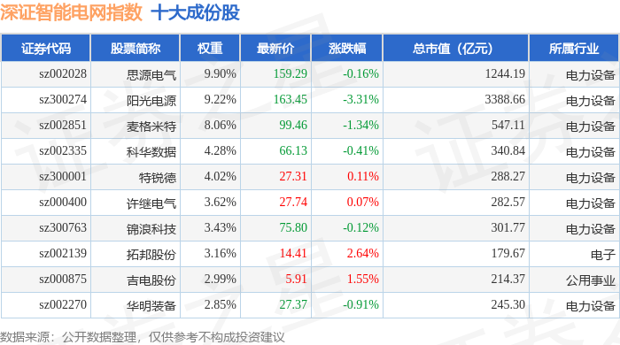 证券之星消息,1月12日,深证智能电网(970054)指数报收于4242.09点,涨0.82%,成交508.73亿元,换手率5.42%。当日该指数成份股中,上涨的有37家,科远智慧以6.48%的涨幅领涨,下跌的有12家,阳光电源以3.31%的跌幅领跌。
