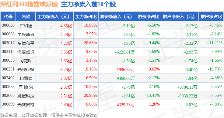 资金流向方面,深红利300(970062)指数成份股当日主力资金净流出合计47.61亿元,游资资金净流出合计2.2亿元,散户资金净流入合计49.81亿元。成份股资金流向详情见下表: