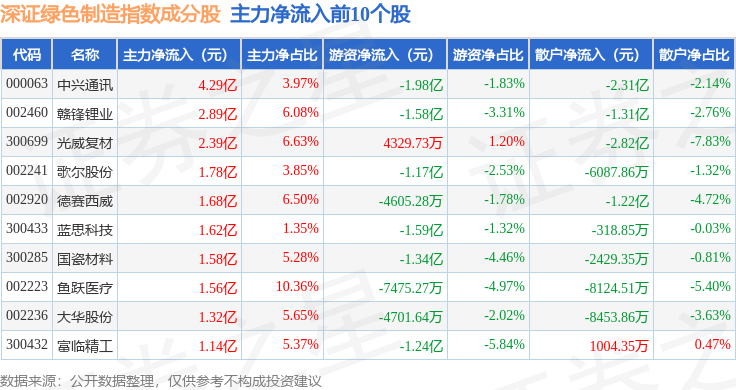 资金流向方面,深证绿色制造(970069)指数成份股当日主力资金净流出合计79.92亿元,游资资金净流入合计15.46亿元,散户资金净流入合计64.46亿元。成份股资金流向详情见下表: