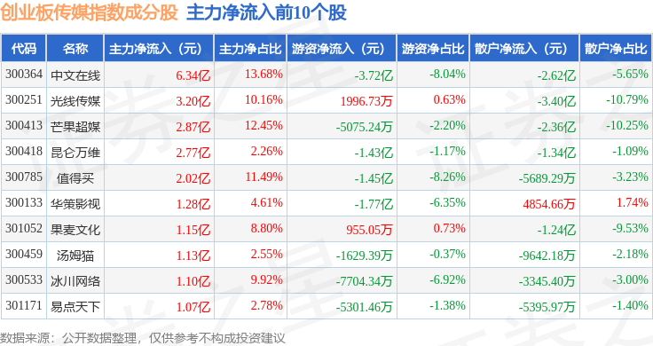 资金流向方面,创业板传媒(970084)指数成份股当日主力资金净流入合计30.95亿元,游资资金净流出合计16.93亿元,散户资金净流出合计14.02亿元。成份股资金流向详情见下表: