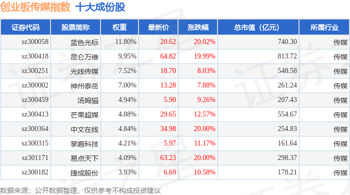 证券之星消息,1月12日,创业板传媒(970084)指数报收于1795.93点,涨13.57%,成交906.57亿元,换手率16.72%。当日该指数成份股中,上涨的有41家,福石控股以20.03%的涨幅领涨。