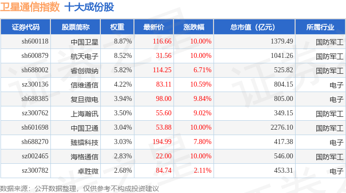 卫星通信(980018)指数十大成份股详情如下: