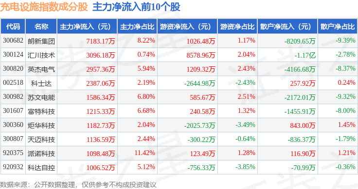 资金流向方面,充电设施(980077)指数成份股当日主力资金净流出合计28.89亿元,游资资金净流入合计11.09亿元,散户资金净流入合计17.96亿元。成份股资金流向详情见下表: