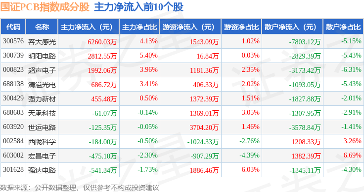 资金流向方面,国证PCB(980115)指数成份股当日主力资金净流出合计68.19亿元,游资资金净流入合计18.34亿元,散户资金净流入合计49.84亿元。成份股资金流向详情见下表: