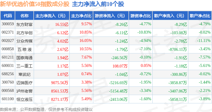 资金流向方面,新华优选价值50(989004)指数成份股当日主力资金净流出合计89.17亿元,游资资金净流入合计11.19亿元,散户资金净流入合计77.98亿元。成份股资金流向详情见下表: