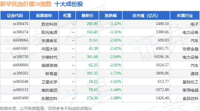 新华优选价值50(989004)指数十大成份股详情如下: