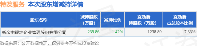证券之星消息,1月12日特发服务发布公告《特发服务:关于持股5%以上股东权益变动触及1%整数倍的公告》,其股东新余市银坤企业管理股份有限公司于2025年7月9日至2026年1月9日间合计减持239.86万股,占公司目前总股本的1.4193%,变动期间该股股价下跌9.0%,截止1月9日收盘报41.14元。