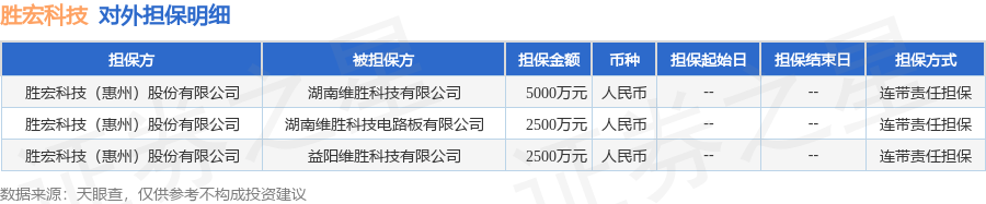 胜宏科技1月8日披露3笔对外担保,被担保公司3家。对外担保明细如下表: