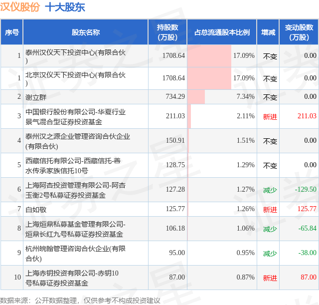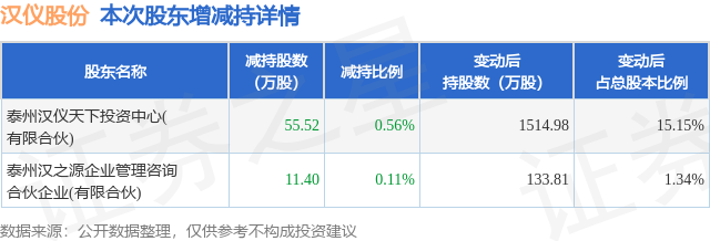 证券之星消息,1月12日汉仪股份发布公告《汉仪股份:关于控股股东及其一致行动人减持股份触及1%整数倍暨股份减持计划实施完毕的公告》,其股东泰州汉仪天下投资中心(有限合伙)、泰州汉之源企业管理咨询合伙企业(有限合伙)于2025年12月26日合计减持66.92万股,占公司目前总股本的0.6692%,变动期间该股股价下跌1.12%,截止12月26日收盘报36.98元。
