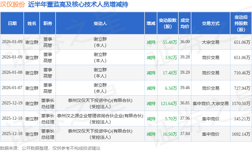 汉仪股份近半年内的董监高及核心技术人员增减持详情如下: