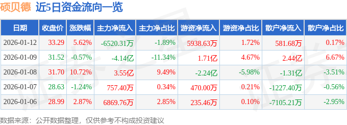 证券之星消息,截至2026年1月12日收盘,硕贝德(300322)报收于33.29元,上涨5.62%,换手率23.8%,成交量104.82万手,成交额34.45亿元。