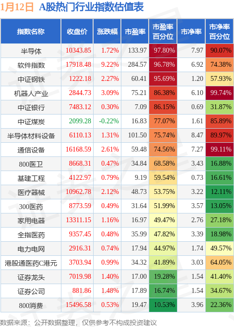 热门行业指数方面,半导体的市盈率百分位较高,为97.8%。而800消费的市盈率百分位较低,为10.53%。