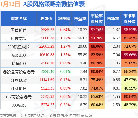 风格策略指数方面,国信价值的市盈率百分位较高,为97.76%。而300成长的市盈率百分位较低,为60.04%。