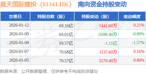 证券之星消息,1月12日南向资金增持1441.6万股昊天国际建投(01341.HK)。近5个交易日中,获南向资金减持的有2天,累计净减持8535.2万股。近20个交易日中,获南向资金减持的有12天,累计净减持4.23亿股。截至目前,南向资金持有昊天国际建投(01341.HK)69.16亿股,占公司已发行普通股的62.32%。