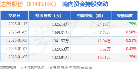 证券之星消息,1月12日南向资金减持24.16万股达势股份(01405.HK)。近5个交易日中,获南向资金增持的有4天,累计净增持17.55万股。近20个交易日中,获南向资金增持的有19天,累计净增持118.85万股。截至目前,南向资金持有达势股份(01405.HK)1325.14万股,占公司已发行普通股的10.07%。