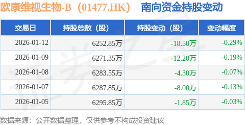 证券之星消息,1月12日南向资金减持18.5万股欧康维视生物-B(01477.HK)。近5个交易日中,获南向资金减持的有5天,累计净减持44.85万股。近20个交易日中,获南向资金减持的有20天,累计净减持134.9万股。截至目前,南向资金持有欧康维视生物-B(01477.HK)6252.85万股,占公司已发行普通股的7.46%。