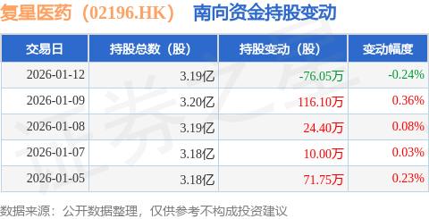 证券之星消息,1月12日南向资金减持76.05万股复星医药(02196.HK)。近5个交易日中,获南向资金增持的有4天,累计净增持146.2万股。近20个交易日中,获南向资金增持的有14天,累计净增持443.95万股。截至目前,南向资金持有复星医药(02196.HK)3.19亿股,占公司已发行普通股的57.78%。