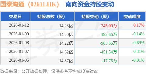 证券之星消息,1月12日南向资金增持245.0万股国泰海通(02611.HK)。近5个交易日中,获南向资金减持的有4天,累计净减持1400.52万股。近20个交易日中,获南向资金减持的有12天,累计净减持4215.19万股。截至目前,南向资金持有国泰海通(02611.HK)14.23亿股,占公司已发行普通股的40.58%。