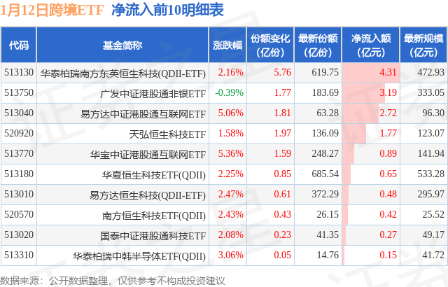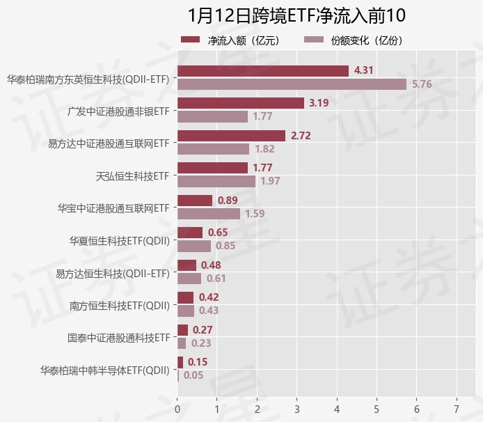 当日有27只跨境ETF基金出现资金净流入,其中净流入排首位的是华泰柏瑞南方东英恒生科技(QDII-ETF)(513130),份额增加了5.76亿份,净流入额为4.31亿元。