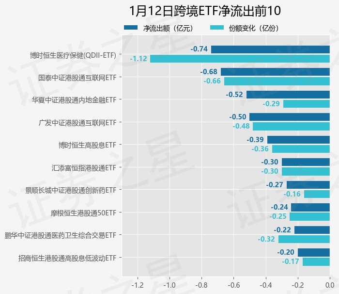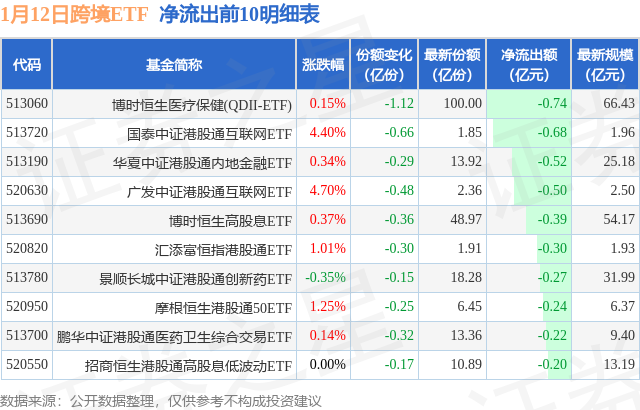 当日有30只跨境ETF基金出现资金净流出,其中净流出排首位的是博时恒生医疗保健(QDII-ETF)(513060),份额减少了1.12亿份,净流出额为7353.81万元。