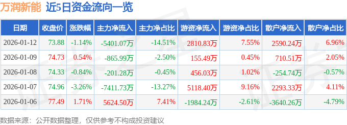 证券之星消息,截至2026年1月12日收盘,万润新能(688275)报收于73.88元,下跌1.14%,换手率5.91%,成交量5.0万手,成交额3.72亿元。