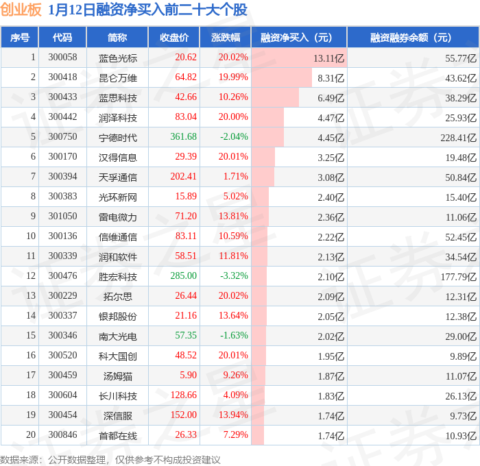 创业板融资净买入前三分别为:蓝色光标(300058)融资净买入13.11亿元、昆仑万维(300418)融资净买入8.31亿元、蓝思科技(300433)融资净买入6.49亿元,前20具体见下表: