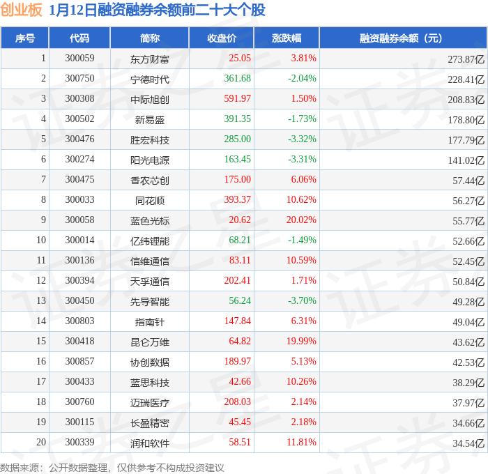 创业板融资融券余额前三分别为:东方财富(300059)融资融券余额273.87亿元、宁德时代(300750)融资融券余额228.41亿元、中际旭创(300308)融资融券余额208.83亿元,前20具体见下表: