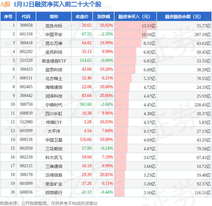 A股融资净买入前三分别为:蓝色光标(300058)融资净买入13.11亿元、中国平安(601318)融资净买入10.16亿元、昆仑万维(300418)融资净买入8.31亿元,前20具体见下表: