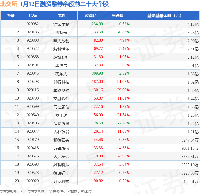 北交所融资融券余额前三分别为:锦波生物(920982)融资融券余额4.13亿元、贝特瑞(920185)融资融券余额3.26亿元、曙光数创(920808)融资融券余额2.9亿元,前20具体见下表:
