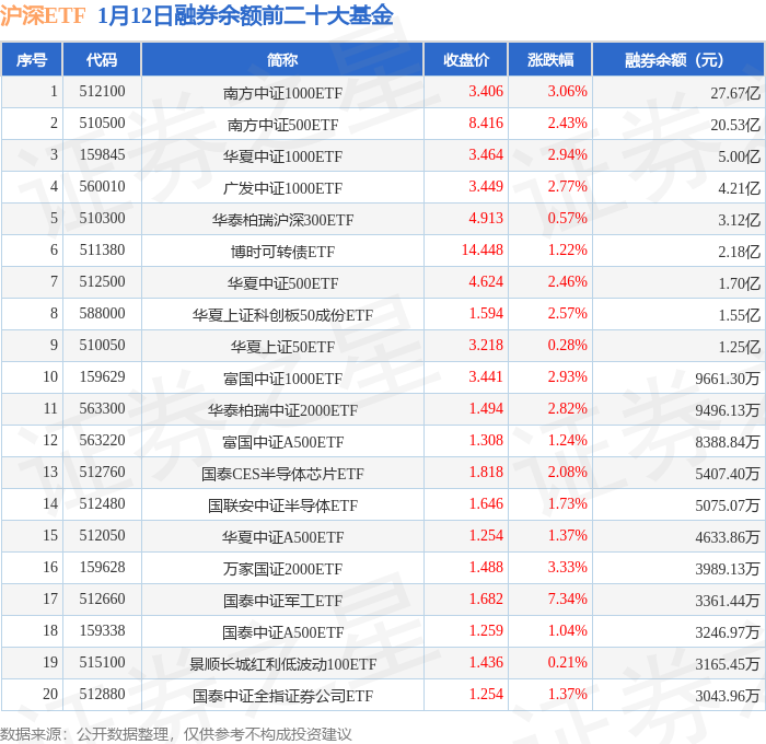 沪深ETF融券余额前三分别为:南方中证1000ETF(512100)融券余额27.67亿元、南方中证500ETF(510500)融券余额20.53亿元、华夏中证1000ETF(159845)融券余额5亿元,前20具体见下表: