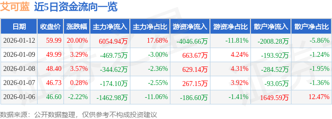 1月12日的资金流向数据方面,主力资金净流入6054.94万元,占总成交额17.68%,游资资金净流出4046.66万元,占总成交额11.81%,散户资金净流出2008.28万元,占总成交额5.86%。