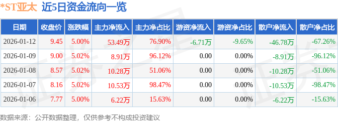 1月12日的资金流向数据方面,主力资金净流入53.49万元,占总成交额76.9%,游资资金净流出6.71万元,占总成交额9.65%,散户资金净流出46.78万元,占总成交额67.26%。