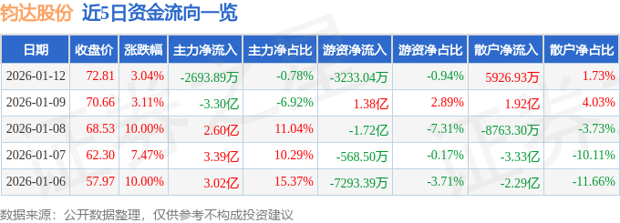 1月12日的资金流向数据方面,主力资金净流出2693.89万元,占总成交额0.78%,游资资金净流出3233.04万元,占总成交额0.94%,散户资金净流入5926.93万元,占总成交额1.73%。