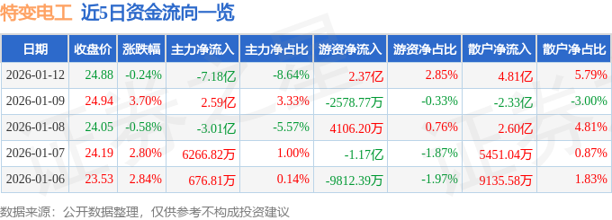 1月12日的资金流向数据方面,主力资金净流出7.18亿元,占总成交额8.64%,游资资金净流入2.37亿元,占总成交额2.85%,散户资金净流入4.81亿元,占总成交额5.79%。