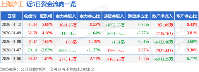 1月12日的资金流向数据方面,主力资金净流入1041.26万元,占总成交额0.52%,游资资金净流出1892.35万元,占总成交额0.95%,散户资金净流入851.09万元,占总成交额0.43%。