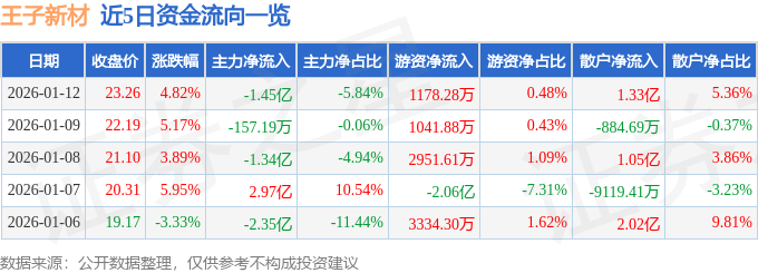 1月12日的资金流向数据方面,主力资金净流出1.45亿元,占总成交额5.84%,游资资金净流入1178.28万元,占总成交额0.48%,散户资金净流入1.33亿元,占总成交额5.36%。