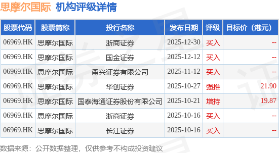 投行对该股的评级以买入为主,近90天内共有5家投行给出买入评级,近90天的目标均价为20.88港元。浙商证券最新一份研报给予思摩尔国际买入评级。
