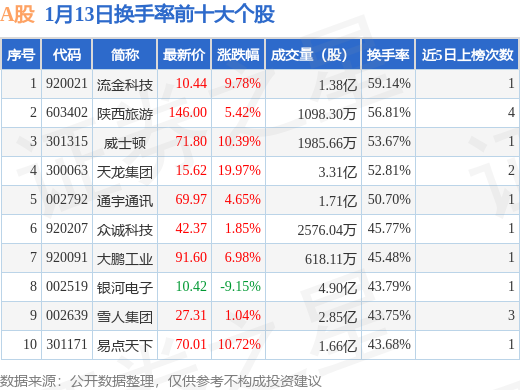 当日A股换手率前10大个股中9只个股收涨,平均涨幅7.87%,其中流金科技(920021)以换手率59.14%排第一,3只个股近5个交易日中多次上榜。