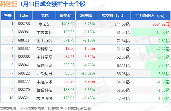 当日科创板成交额前10大个股中3只个股收涨,平均涨幅5.98%,其中寒武纪(688256)以成交额144.69亿元排第一。从主力资金流入看,成交额前10大个股中有1只个股呈现主力资金净流入。