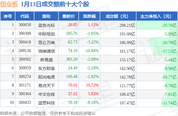 当日创业板成交额前10大个股中3只个股收涨,平均涨幅5.89%,其中蓝色光标(300058)以成交额298.21亿元排第一。
