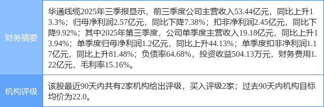 2025年11月18日,华鑫证券研究员张涵,罗笛箫发布了对华通线缆的研报《公司动态研究报告:持续加强海外布局,电解铝贡献利润弹性》,该研报对华通线缆给出“买入”评级。研报中预测公司2025-2027年收入分别为74.25、92.82、112.84亿元,EPS分别为0.68、1.23、2.04元,当前股价对应PE分别为54.1、30.0、18.1倍,给予“买入”投资评级。证券之星数据中心根据近三年发布的研报数据计算,该研报作者对此股的盈利预测准确度为50.8%。