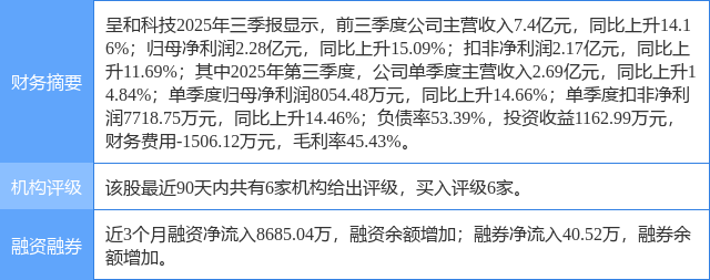 2025年11月9日,太平洋研究员王亮,王海涛发布了对呈和科技的研报《呈和科技2025年三季报点评:国产替代与海外扩张支撑公司稳健增长》,该研报对呈和科技给出“买入”评级。研报中预计2025-2027年EPS分别为1.49元、1.75元、2.08元。维持“买入”评级。证券之星数据中心根据近三年发布的研报数据计算,该研报作者对此股的盈利预测准确度为73.89%。