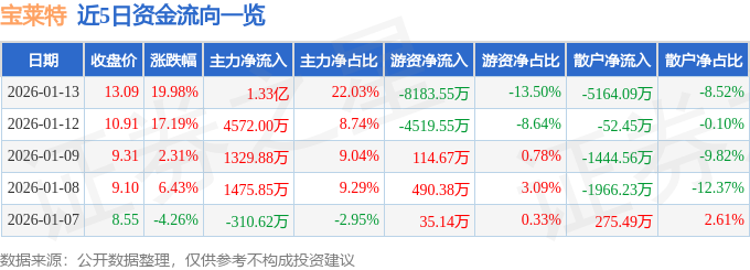1月13日的资金流向数据方面,主力资金净流入1.33亿元,占总成交额22.03%,游资资金净流出8183.55万元,占总成交额13.5%,散户资金净流出5164.09万元,占总成交额8.52%。