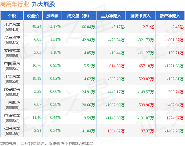 个股表现方面,商用车行业当日领跌股为江淮汽车(600418),该股当日报收48.24,下跌3.17%,成交量66.04万,主力资金净流出5.17亿元。汉马科技(600375)以下跌1.31%紧随其后,该股当日成交量42.94万,主力资金净流出479.64万元。除此之外,安凯客车(000868)、中国重汽(000951)、江铃汽车(000550)均进入当日熊股之列。具体个股列表见下表: