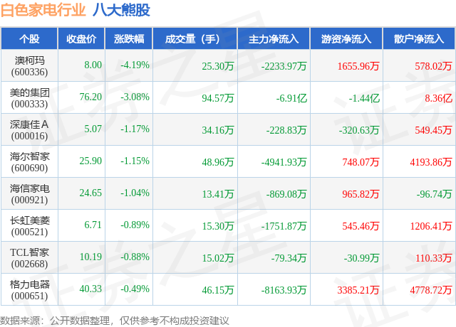 个股表现方面,白色家电行业当日领跌股为澳柯玛(600336),该股当日报收8.0,下跌4.19%,成交量25.3万,主力资金净流出2233.97万元。美的集团(000333)以下跌3.08%紧随其后,该股当日成交量94.57万,主力资金净流出6.91亿元。除此之外,深康佳A(000016)、海尔智家(600690)、海信家电(000921)均进入当日熊股之列。具体个股列表见下表: