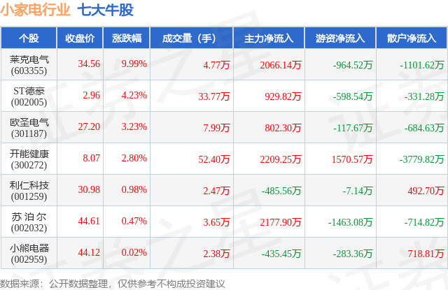 个股表现方面,小家电行业当日领涨股为莱克电气(603355),该股当日报收34.56,上涨9.99%,成交量4.77万,主力资金净流入2066.14万元。ST德豪(002005)以上涨4.23%紧随其后,该股当日成交量33.77万,主力资金净流入929.82万元。除此之外,欧圣电气(301187)、开能健康(300272)、利仁科技(001259)均进入当日牛股之列。具体个股列表见下表: