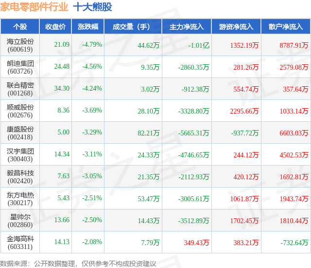 个股表现方面,家电零部件行业当日领跌股为海立股份(600619),该股当日报收21.09,下跌4.79%,成交量44.62万,主力资金净流出1.01亿元。朗迪集团(603726)以下跌4.56%紧随其后,该股当日成交量9.35万,主力资金净流出2860.35万元。除此之外,联合精密(001268)、顺威股份(002676)、康盛股份(002418)均进入当日熊股之列。具体个股列表见下表: