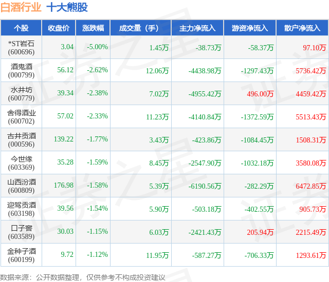 个股表现方面,白酒行业当日领跌股为*ST岩石(600696),该股当日报收3.04,下跌5.0%,成交量1.45万,主力资金净流出38.73万元。酒鬼酒(000799)以下跌2.62%紧随其后,该股当日成交量12.06万,主力资金净流出4438.98万元。除此之外,水井坊(600779)、舍得酒业(600702)、古井贡酒(000596)均进入当日熊股之列。具体个股列表见下表: