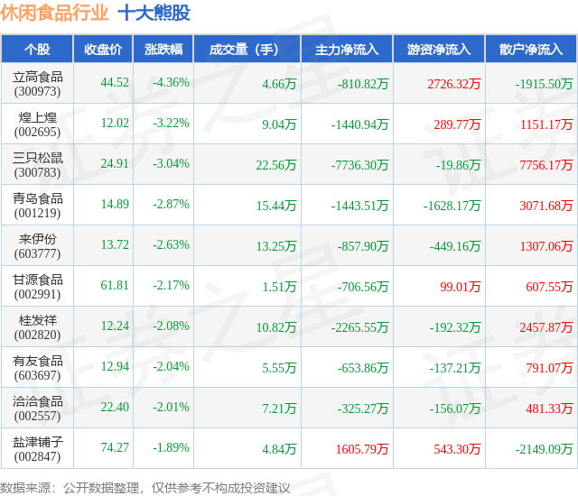 个股表现方面,休闲食品行业当日领跌股为立高食品(300973),该股当日报收44.52,下跌4.36%,成交量4.66万,主力资金净流出810.82万元。煌上煌(002695)以下跌3.22%紧随其后,该股当日成交量9.04万,主力资金净流出1440.94万元。除此之外,三只松鼠(300783)、青岛食品(001219)、来伊份(603777)均进入当日熊股之列。具体个股列表见下表: