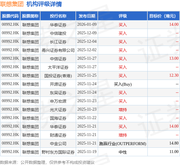 截至2026年1月13日收盘,联想集团(00992.HK)报收于8.95港元,下跌0.44%,成交量1.24亿股,成交额11.23亿港元。投行对该股的评级以买入为主,近90天内共有11家投行给出买入评级,近90天的目标均价为13.18港元。华泰证券最新一份研报给予联想集团买入评级,目标价14港元。